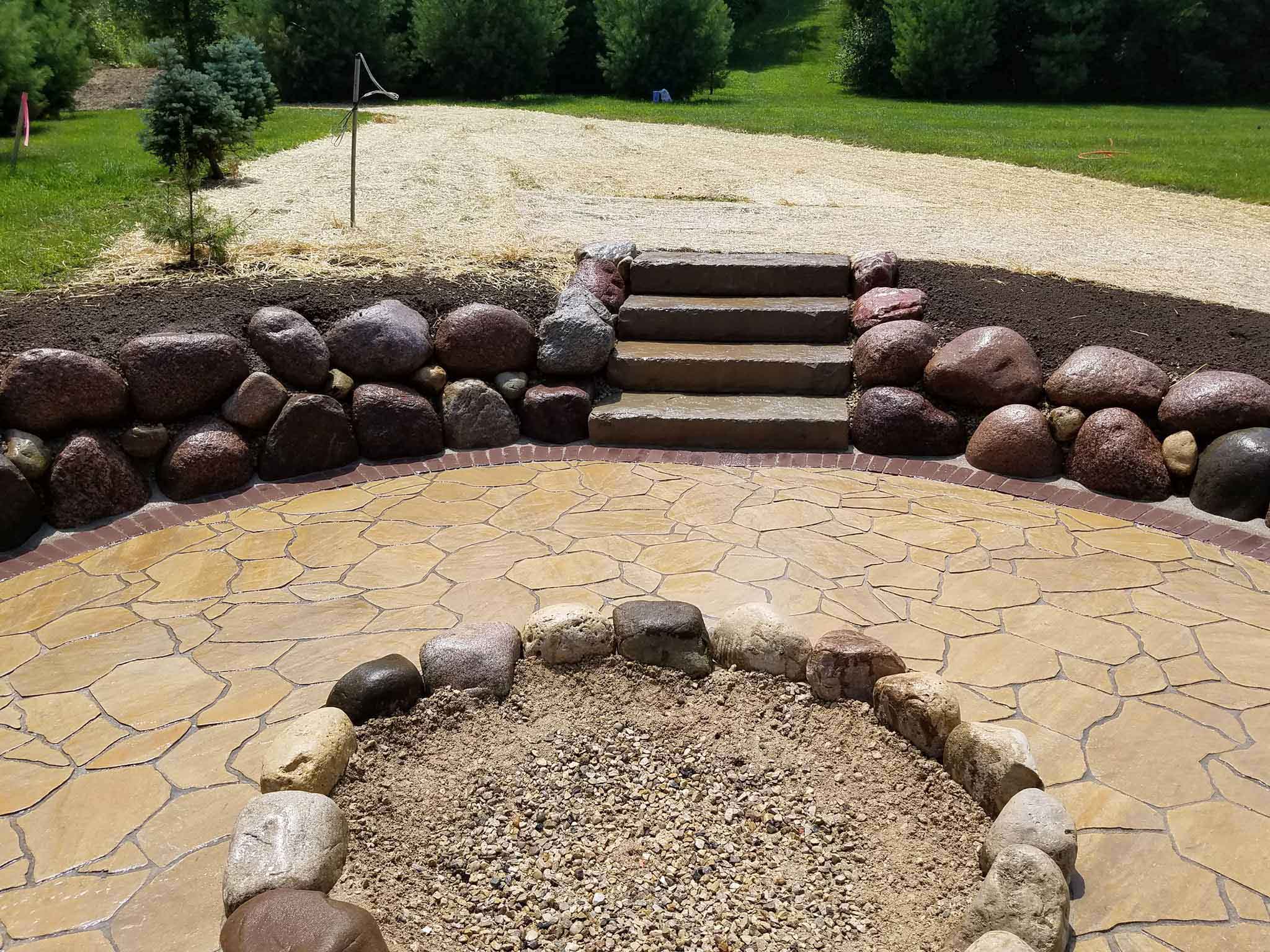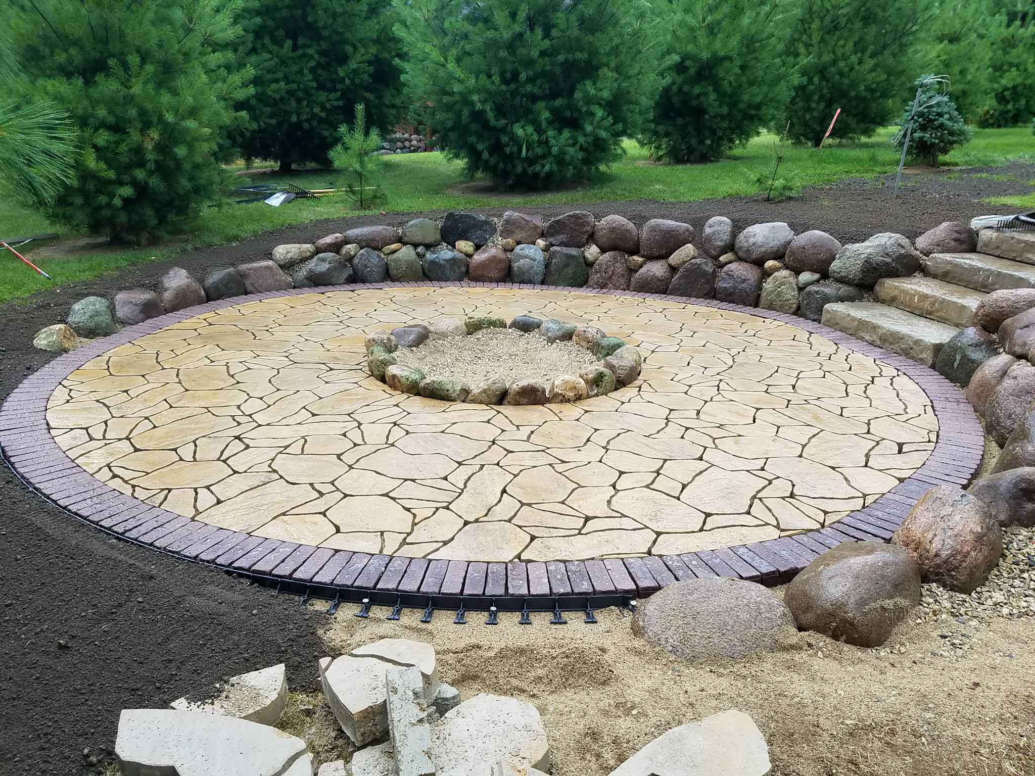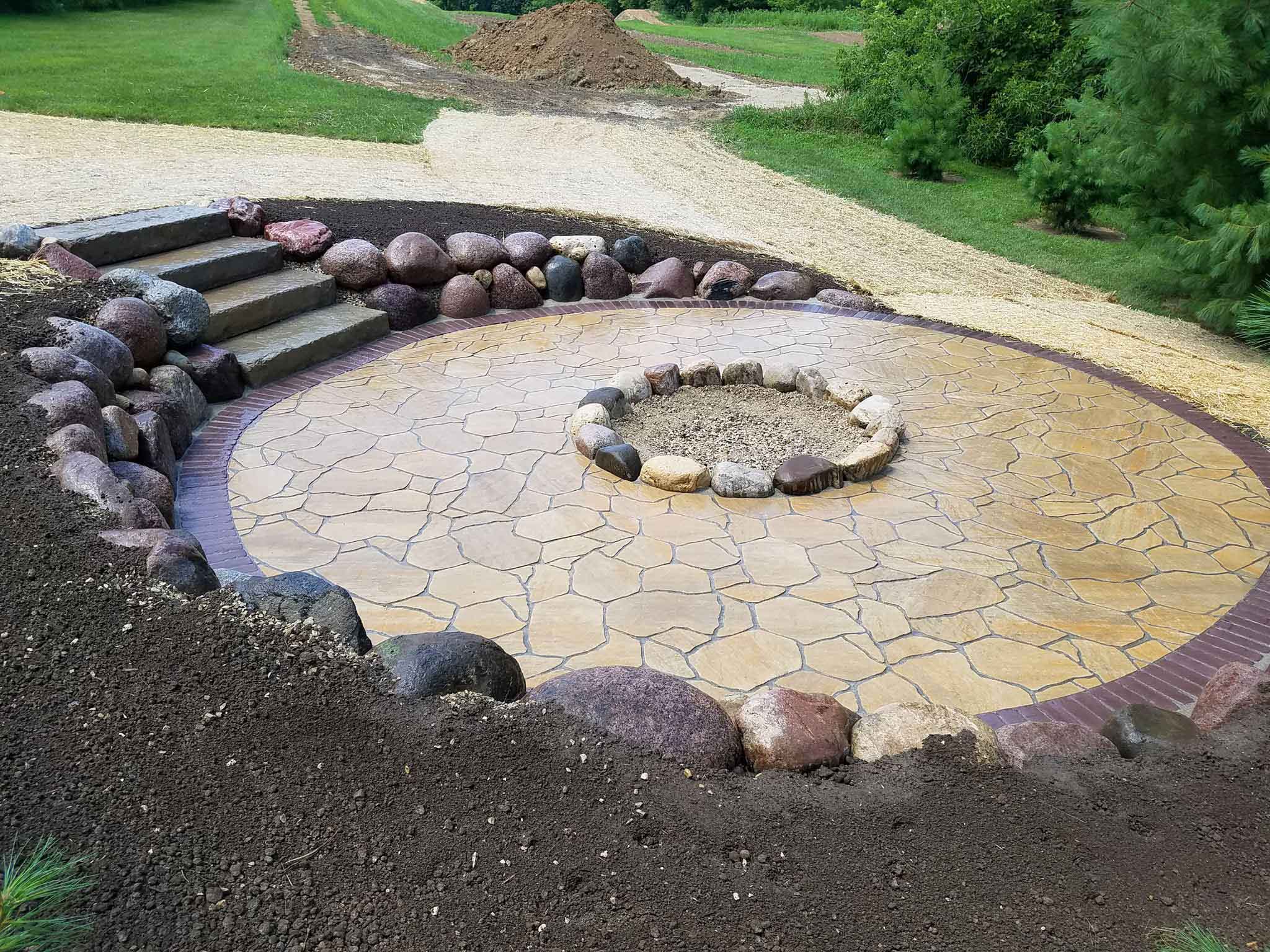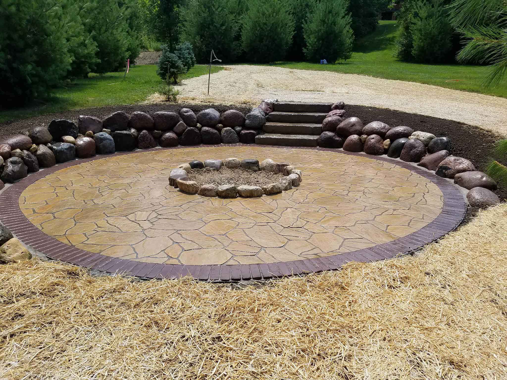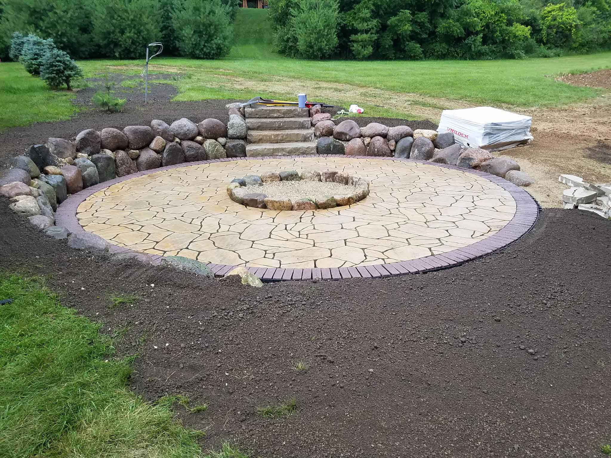 We love the new customers we meet in our business. We develop such a great working relationship with our clients that many even become personal friends. In the case of this Neosho, Wisconsin fire pit project we did the work for a client who was already a lifelong friend. Homeowners, Jeff and Wanda, had a vision spending time relaxing and entertaining around a beautiful fire pit in their own secluded back yard on the lake.