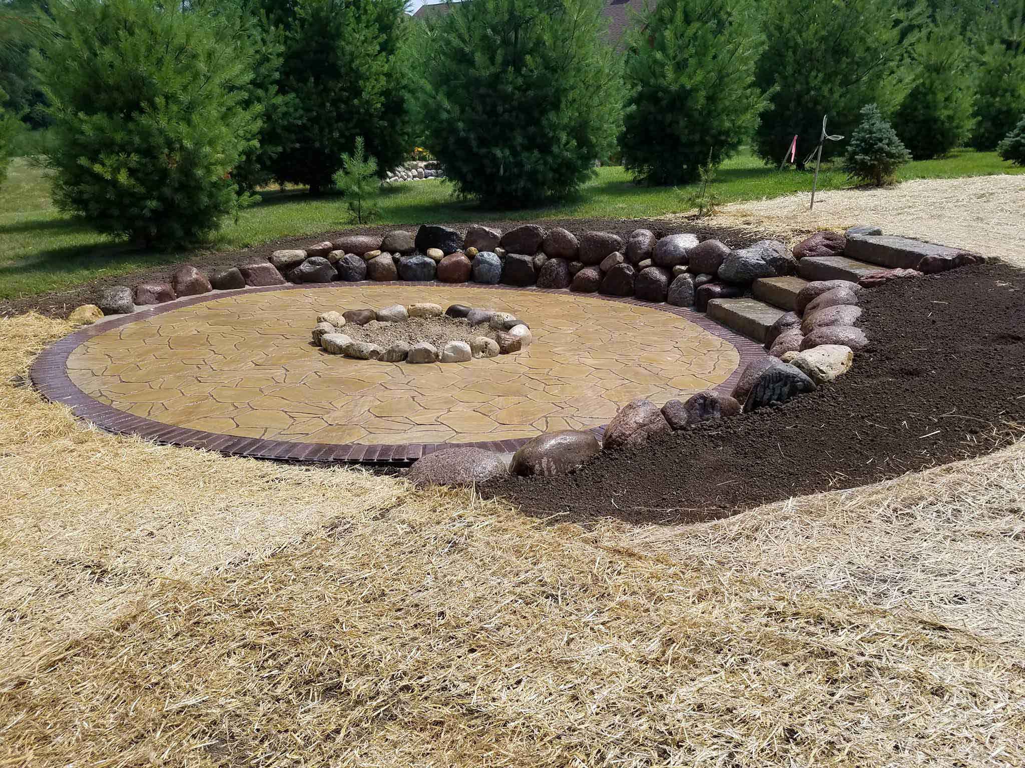 We brought in County Materials (a Wisconsin-based company) Destination Style Paver for the surface. We bordered those pavers with a UniLock Copthorne Paver as an accent. The finished project was a 16 foot diameter, circular paver area with a center fire pit approximately 5 feet in diameter. That should provide the family and friends with plenty of heat!