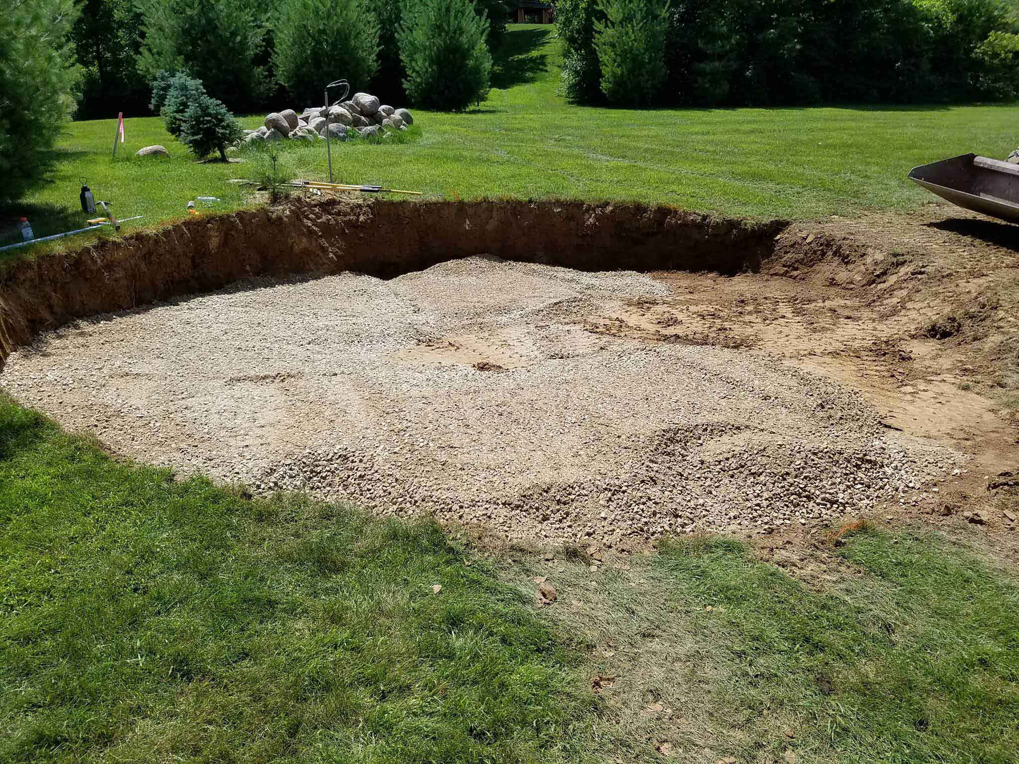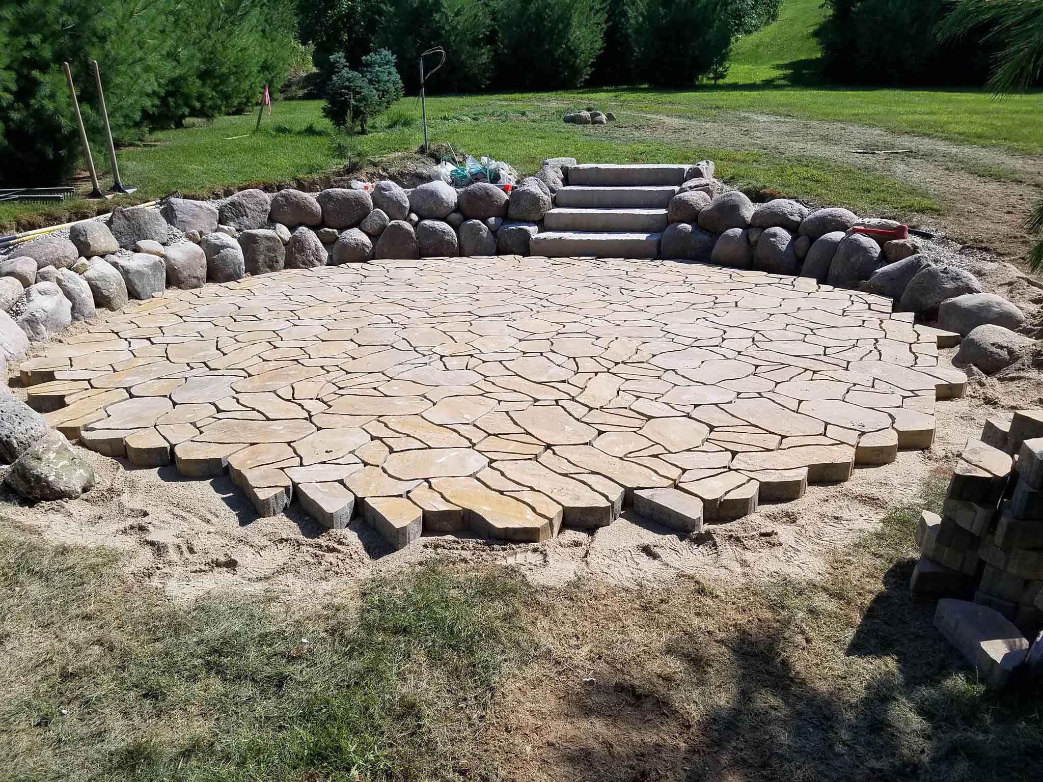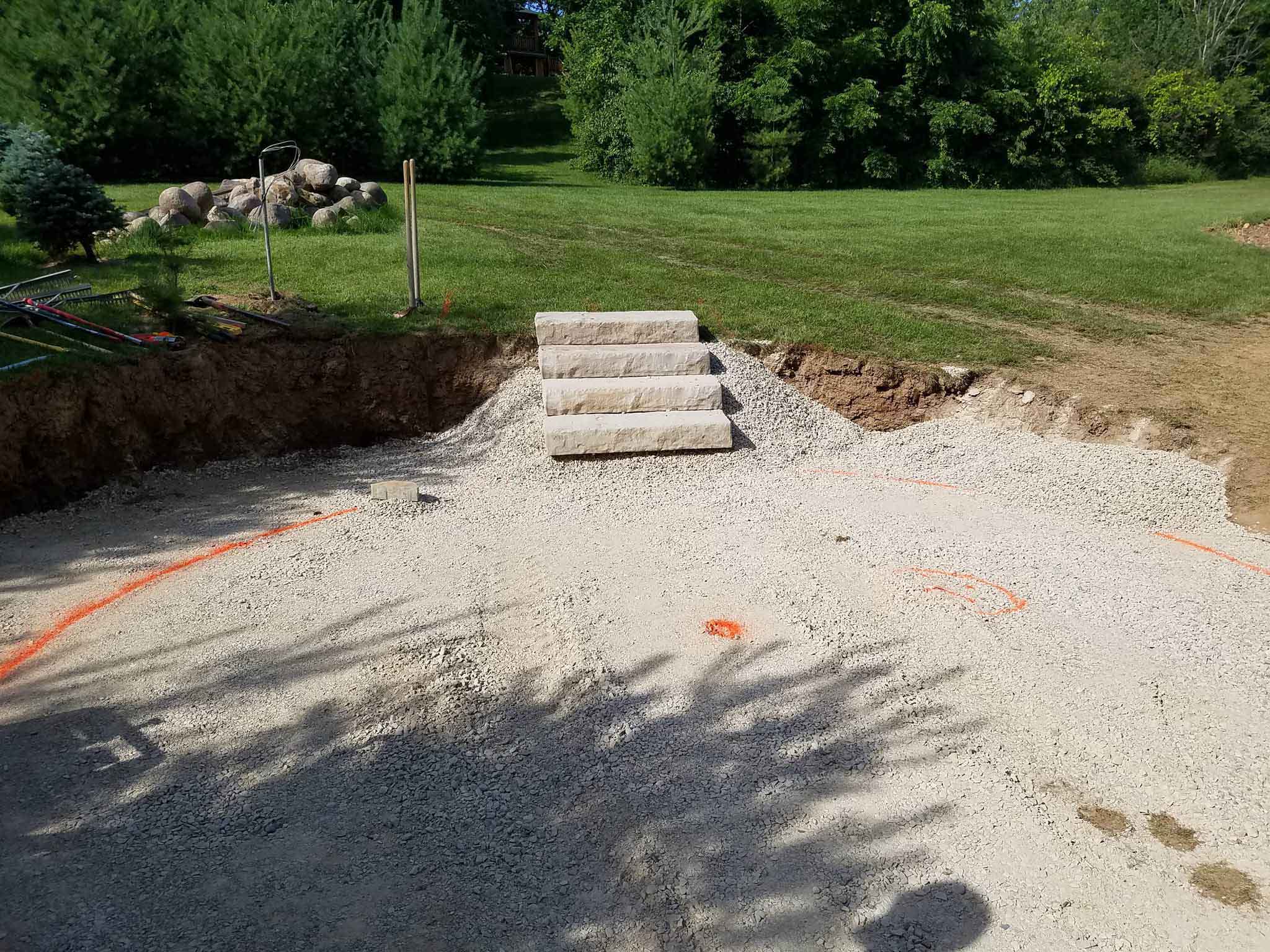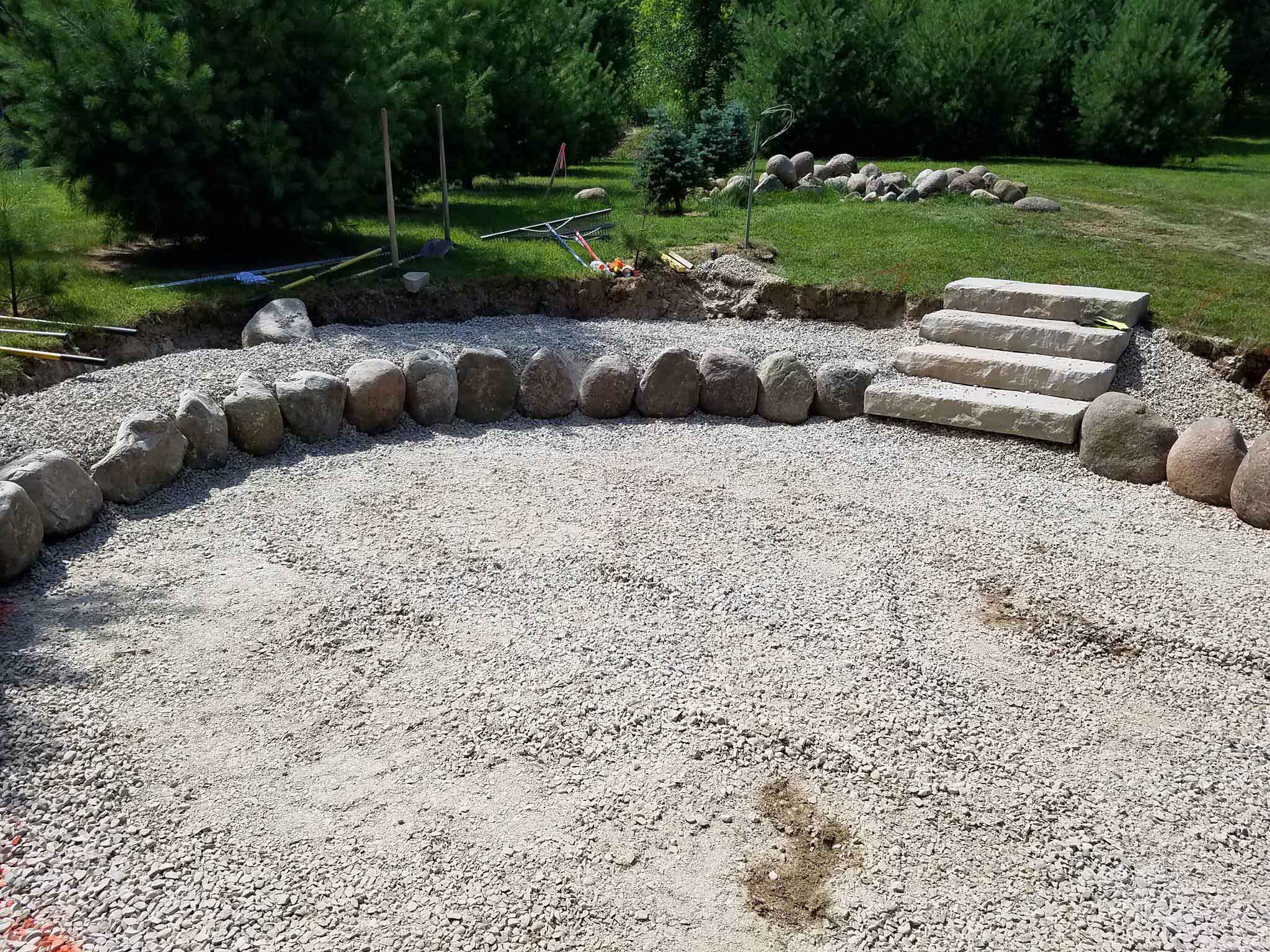 Jeff had already excavated and gathered fieldstone boulders right from his property. We utilized the fieldstone along with pavers they picked out for the surface area to build into the hillside.