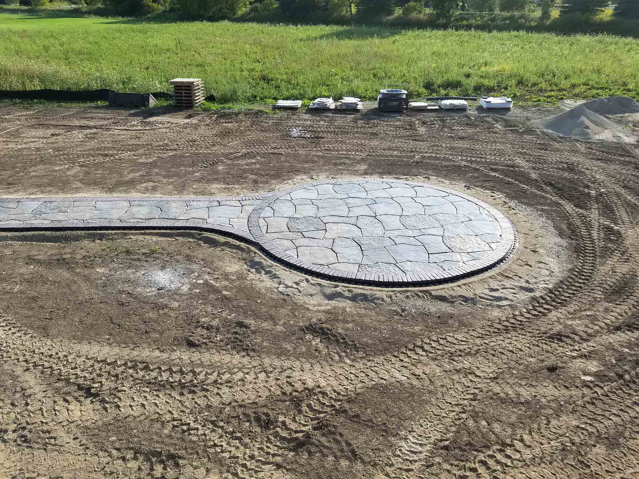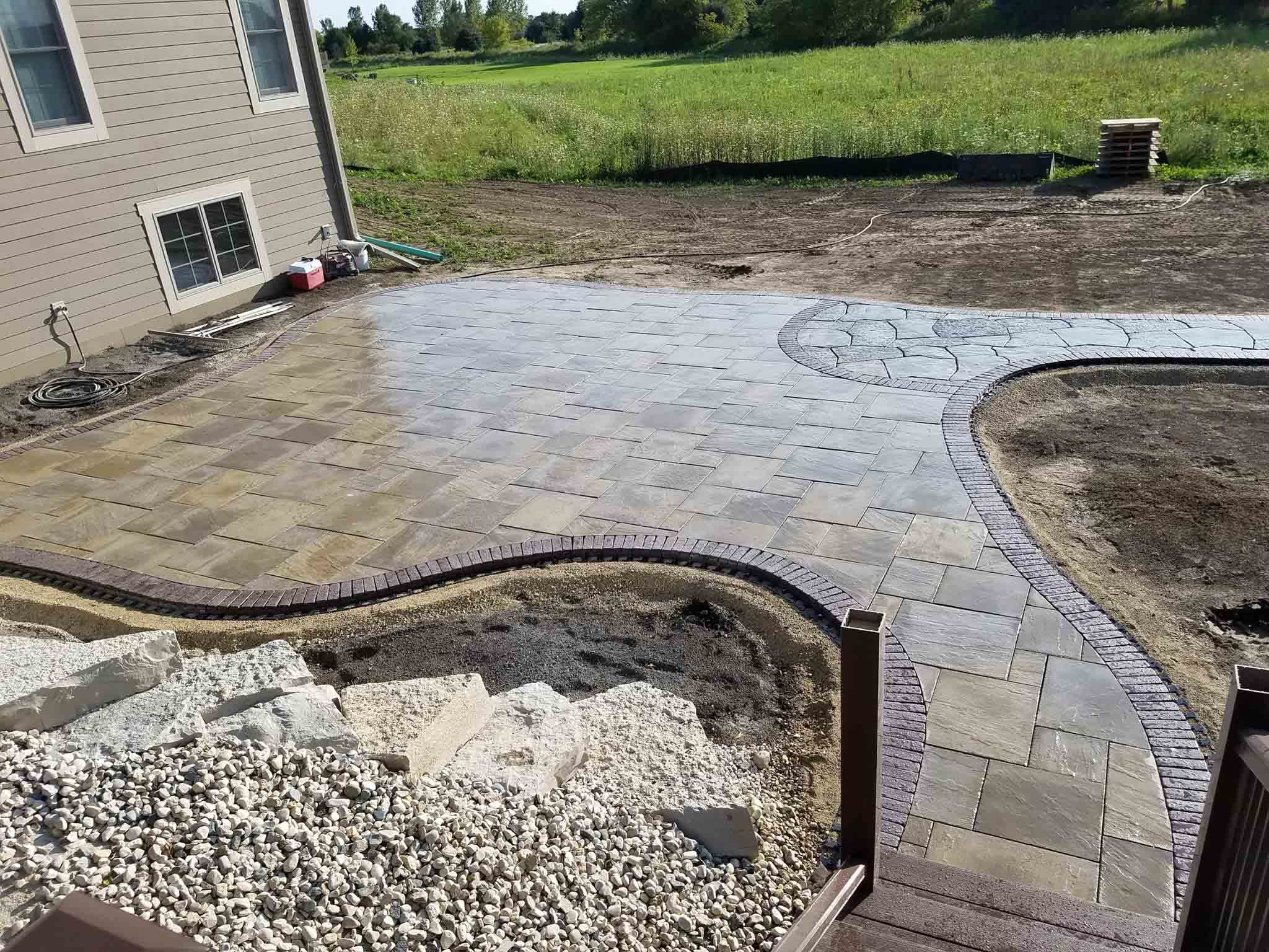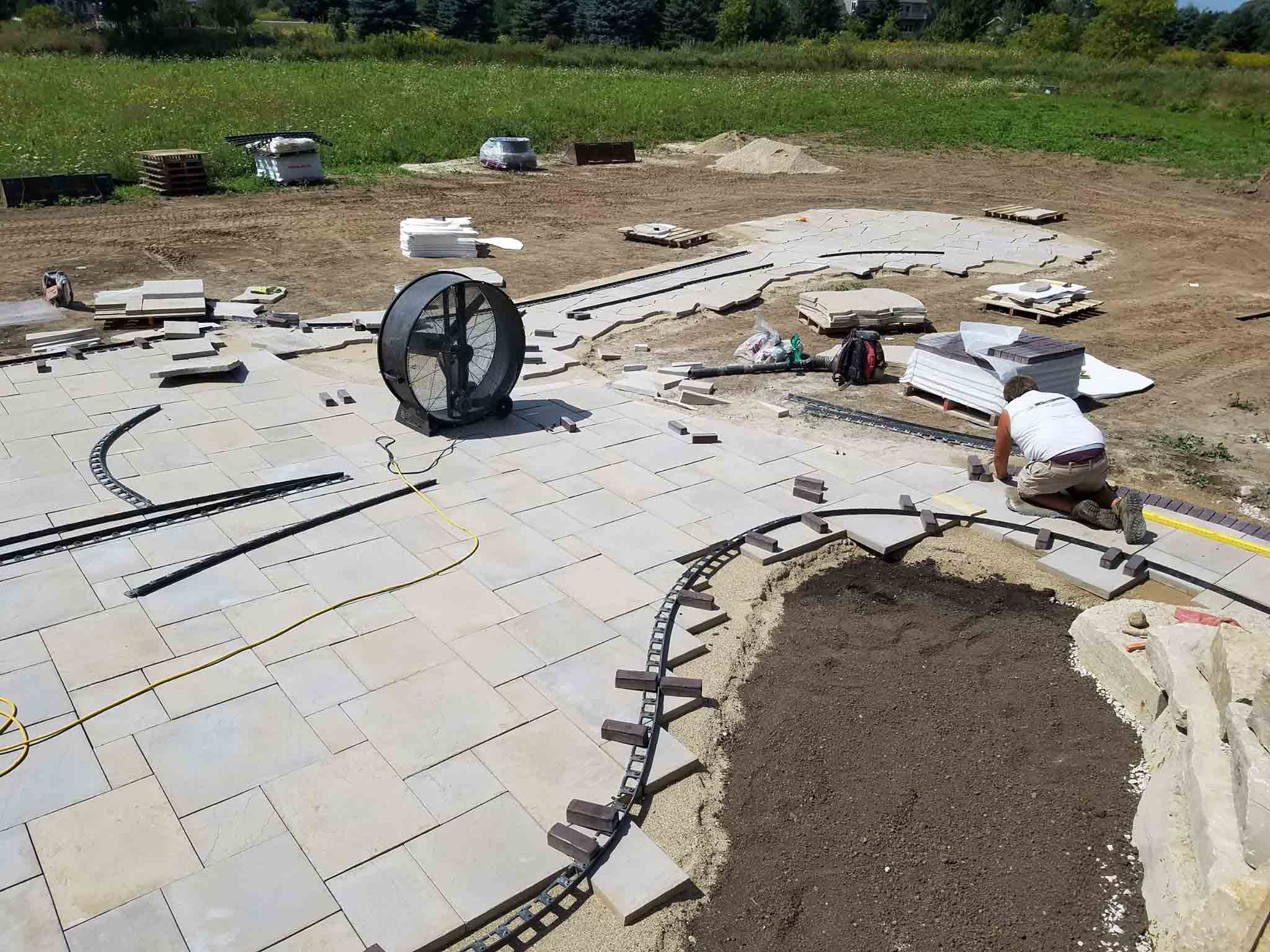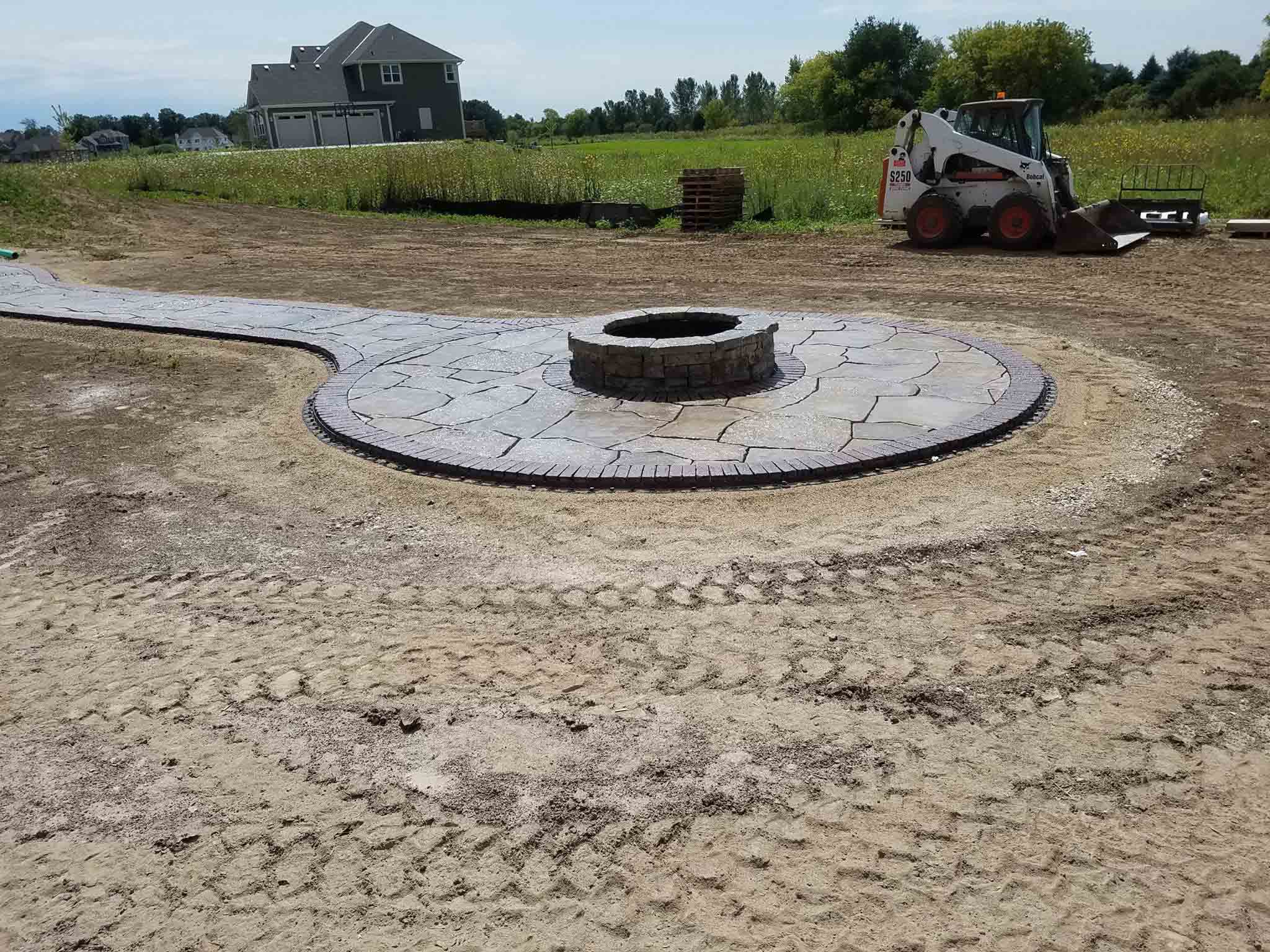 Progress being made on the patio. A lot of back-breaking work involved to execute these projects. Next, a polymeric sand is swept into the joints of the pavers and then we’ll add some large outcropping for seats around the fire-pit, low voltage lighting, and then back on site in a couple weeks to do plantings, decorative stone in the beds, and finally the lawn.