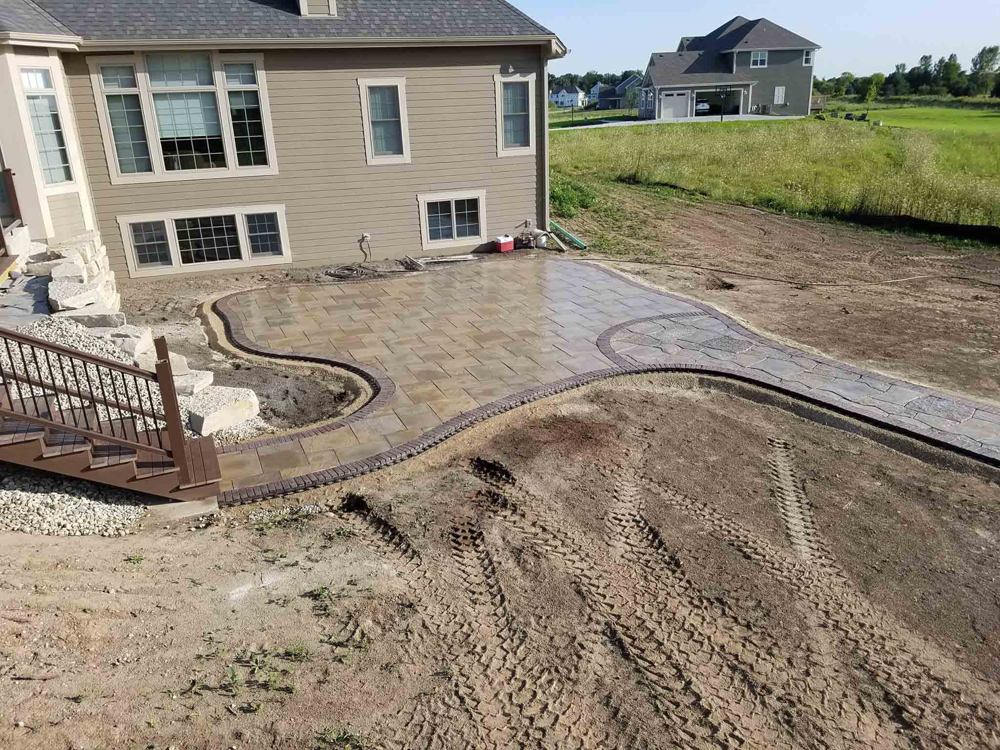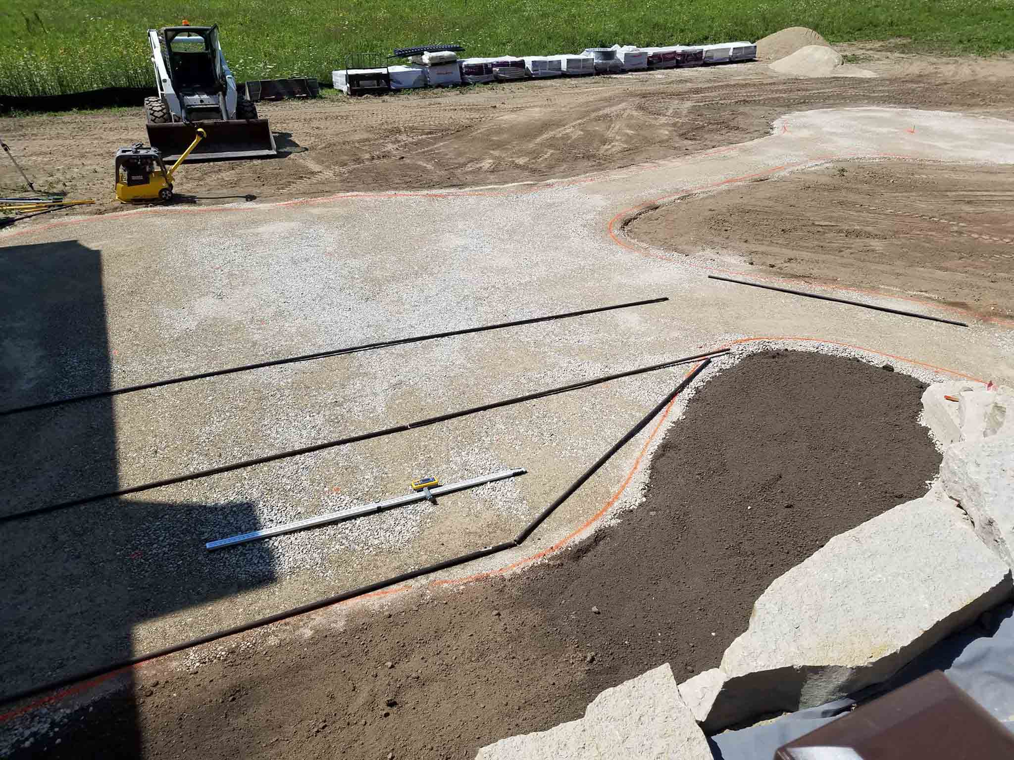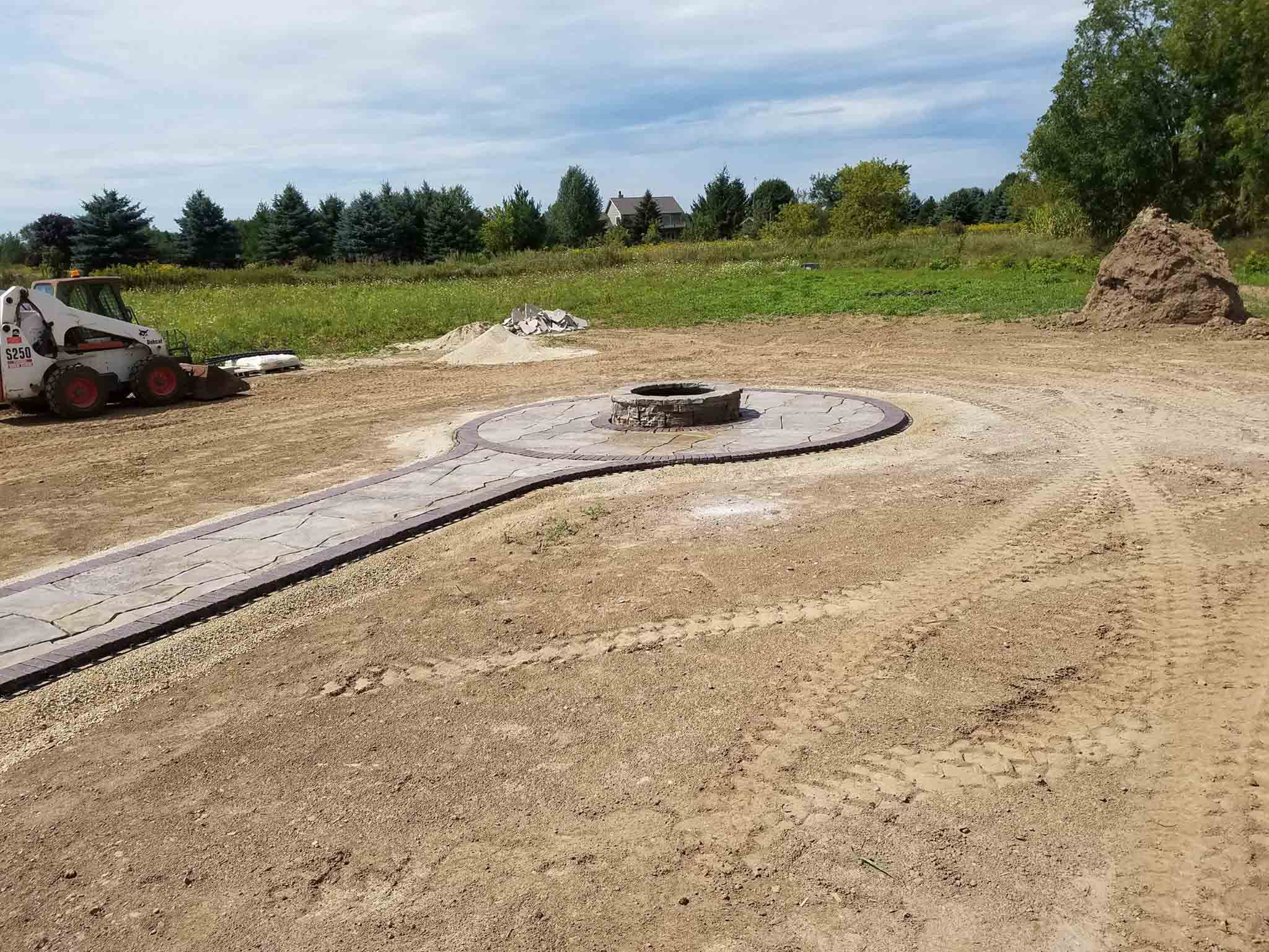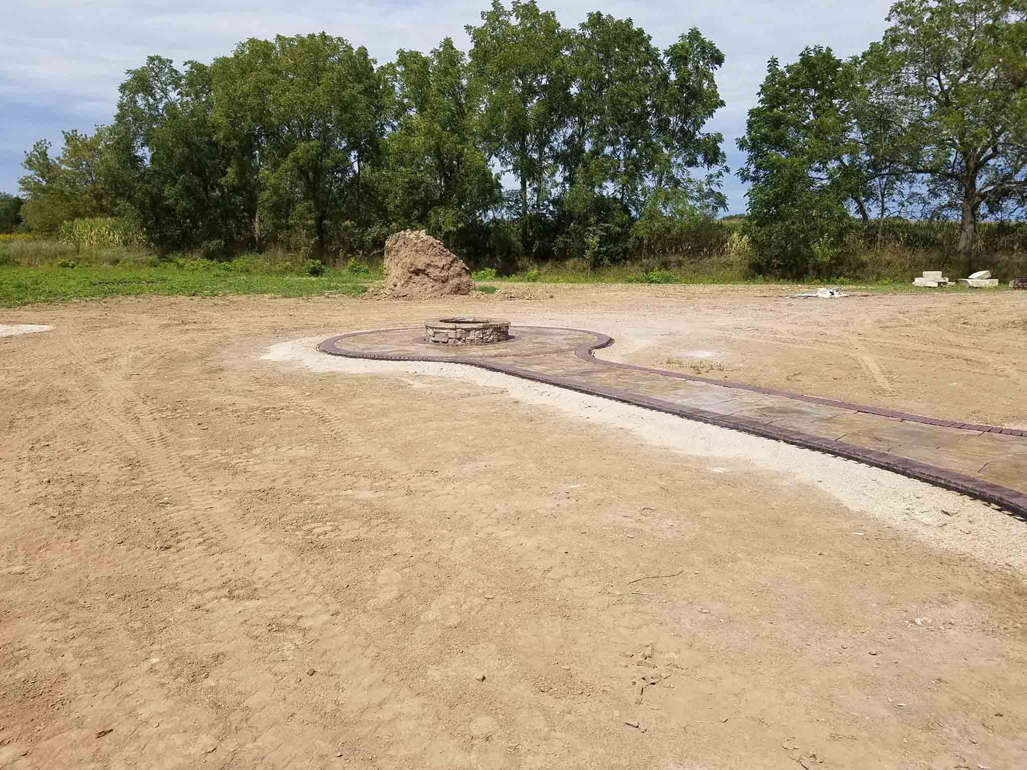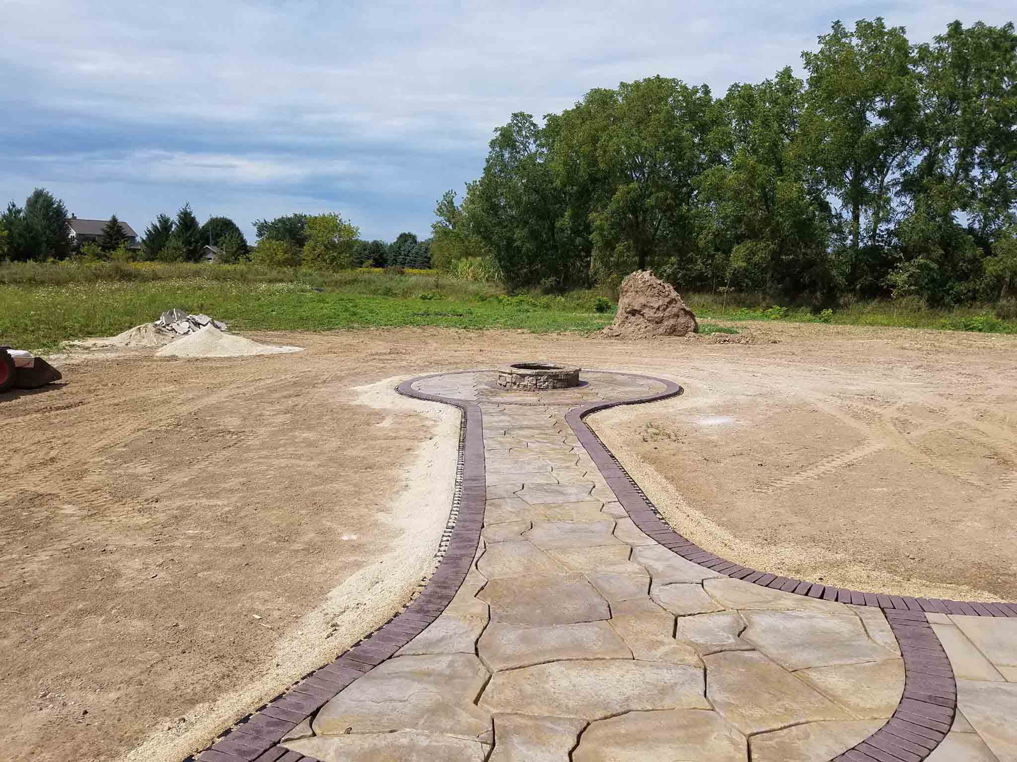 Progress being made on the patio. A lot of back-breaking work involved to execute these projects. Next, a polymeric sand is swept into the joints of the pavers and then we’ll add some large outcropping for seats around the fire-pit, low voltage lighting, and then back on site in a couple weeks to do plantings, decorative stone in the beds, and finally the lawn.